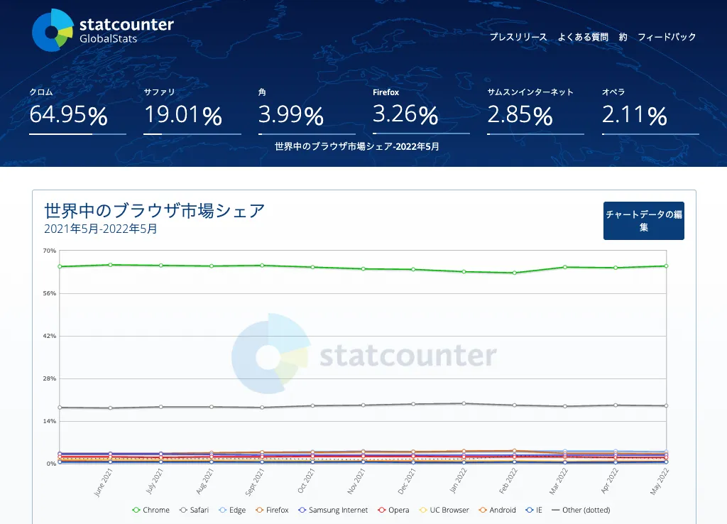少し横道にそれますが、ブラウザのシェア率はWebデベロッパーやデザイナーにとっては大事な認識です。デスクトップとモバイルとで、どんなブラウザが一般的に使われているかを知っているとそれを対象に開発を進めることができます。
